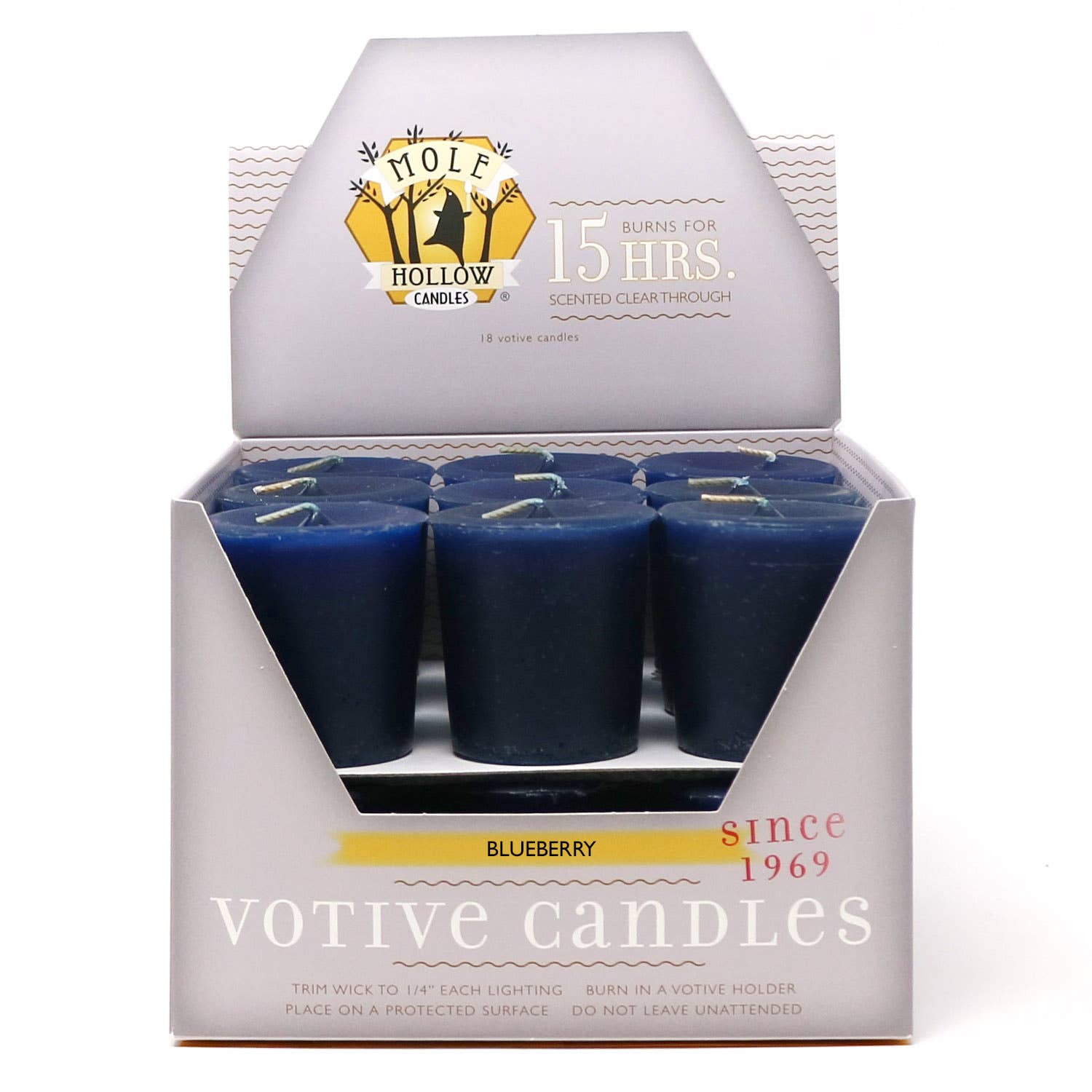 Mole Hollow Candles’ Blueberry scented votive candles feature a 100% cotton wick and custom-blended scent. Each votive burns for 15 hours and is labelled for individual sale.