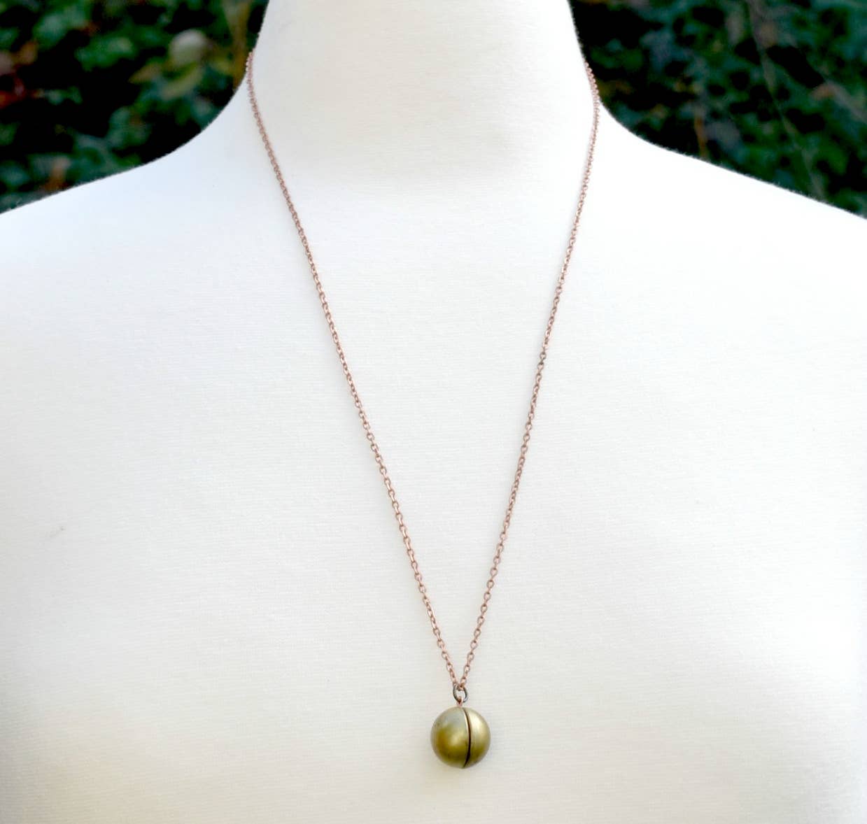 This simple modern brass ball locket comes with a strip of accordion folded paper, perfect for writing a wish or a love note message. The locket measures approximately 18mm (about 3/4 inch) and hangs from a 22 inch copper chain. There is some oxidization on the locket giving the necklace a lovely antiqued look.