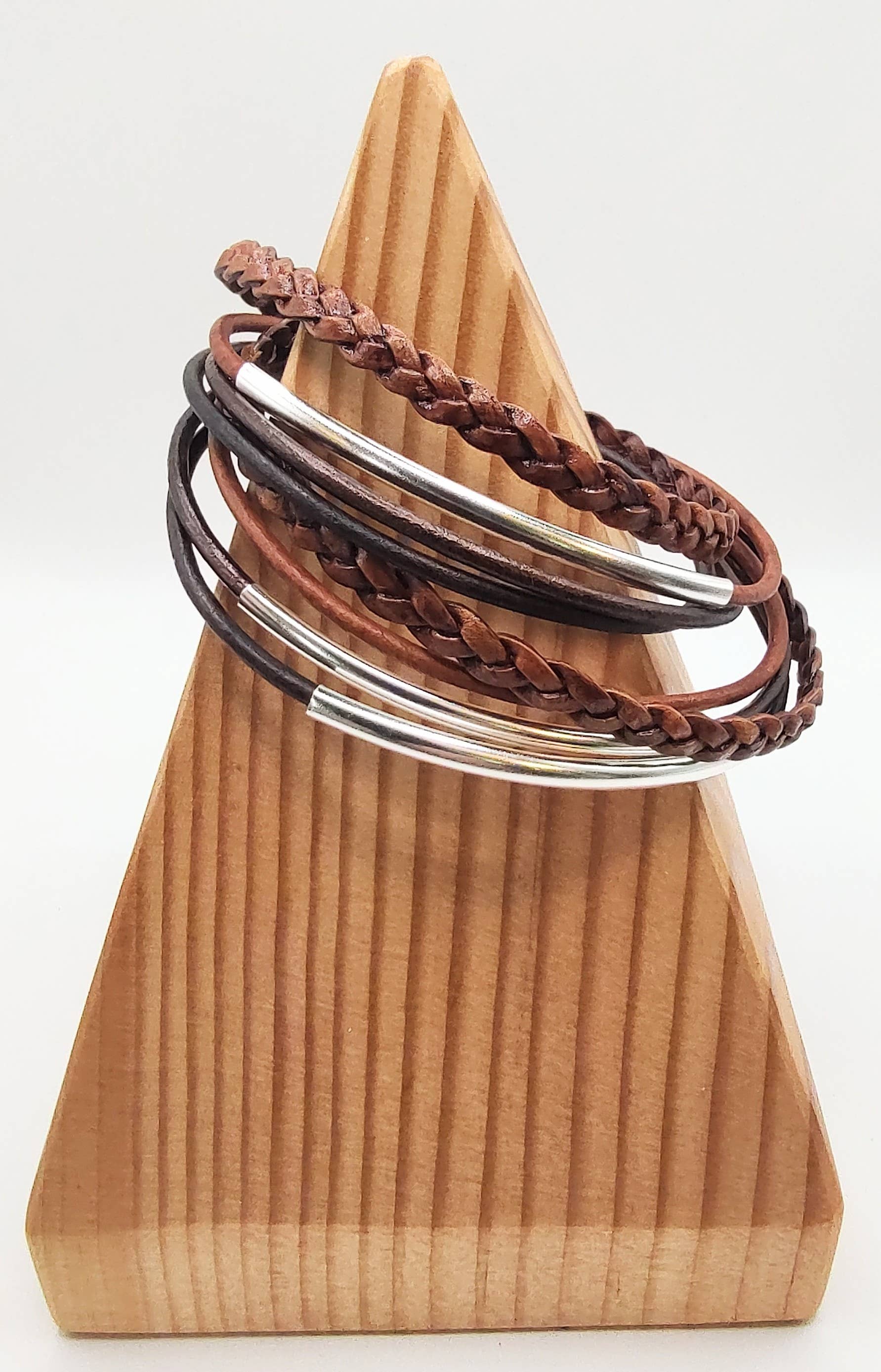 A double wrap bracelet made with licorice leather and flat braided leather. It can be worn as a double wrapped bracelet or a single necklace. It is a 100% real leather bracelet made with 2 mm licorice cord, braided flat leather, and silver plated tubes. It has a total of five leather cords that are wrapped around the wrist twice, allowing for a ten cord multilayered effect and it is made to fit the average wrist size of approximately 6 1/2 to 7 inches.