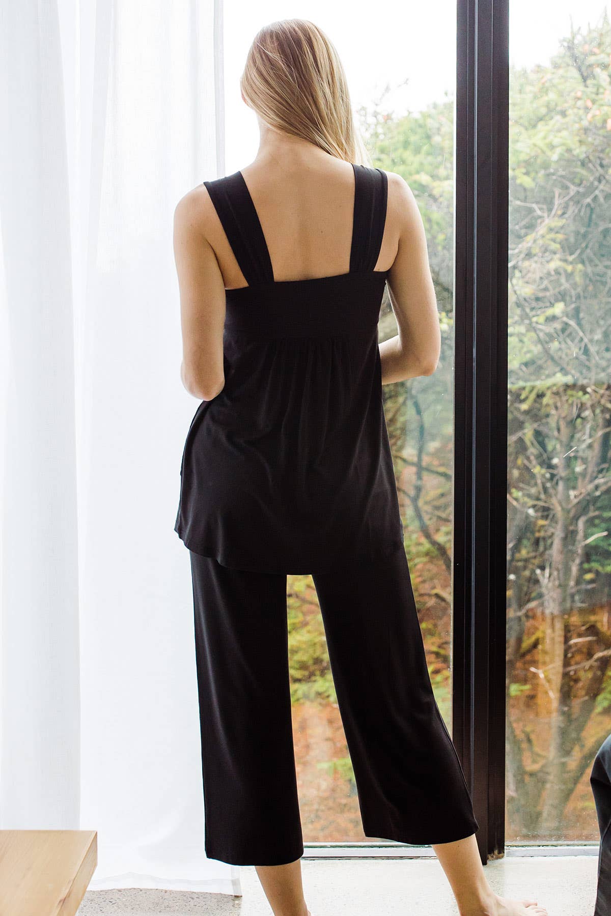 The Cleo Pajama Set is an update from the original and adorable from any angle! Babydoll style top boasts a roomier double-layered bust, heavier fabric, wide straps, pockets, and an empire waist. Cropped pant has a soft elastic waistband and V shaping to flatter your backside.