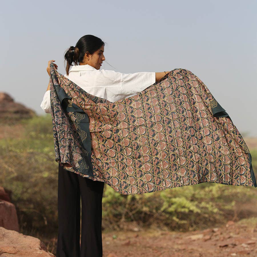 This large green pattern scarf is hand block printed with a mud resist technique called Dabu. Dabu translates to "pressing". Where ever the resist is pressed, the dye doesn't go on it. Several steps of printing and dyeing brought us this mix of unique colors. This pattern is inspired by small windows that were carved in walls for the breeze to come in and out. I always saw it as freedom. We hope this scarf will be a reminder for you to never settle and always look for your small windows to live freely.