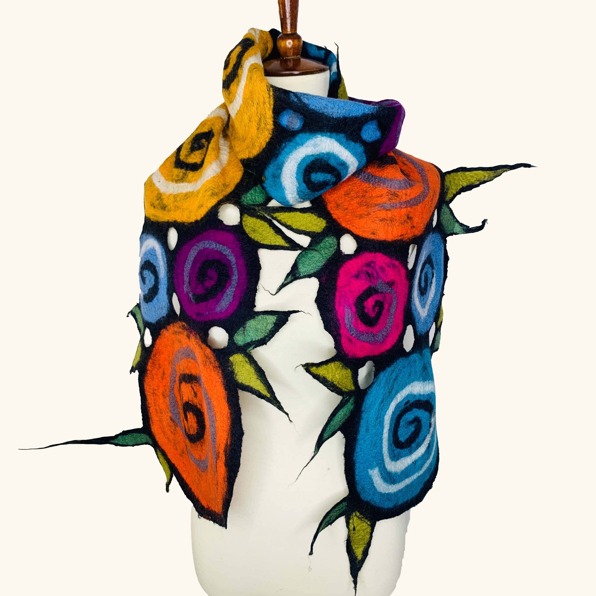 A whimsical and spiraling flower design with leaves cutout design. Wear as a scarf or display as a wrap. All scarves are handmade, fair trade, and handled with care. Consists of merino wool on chiffon from Nepal.