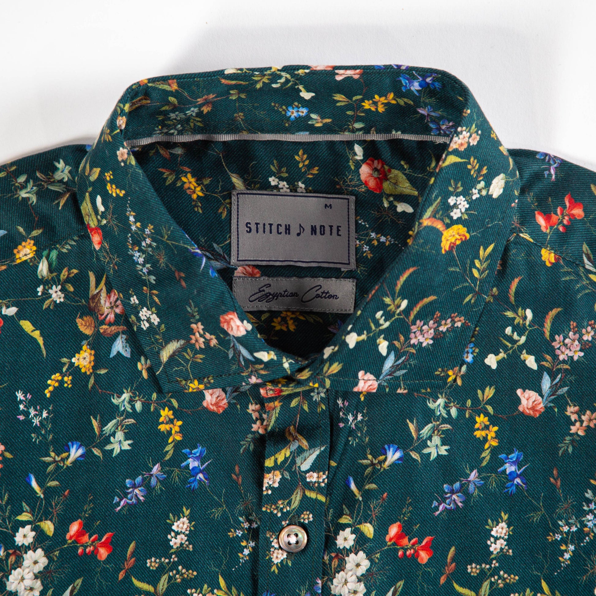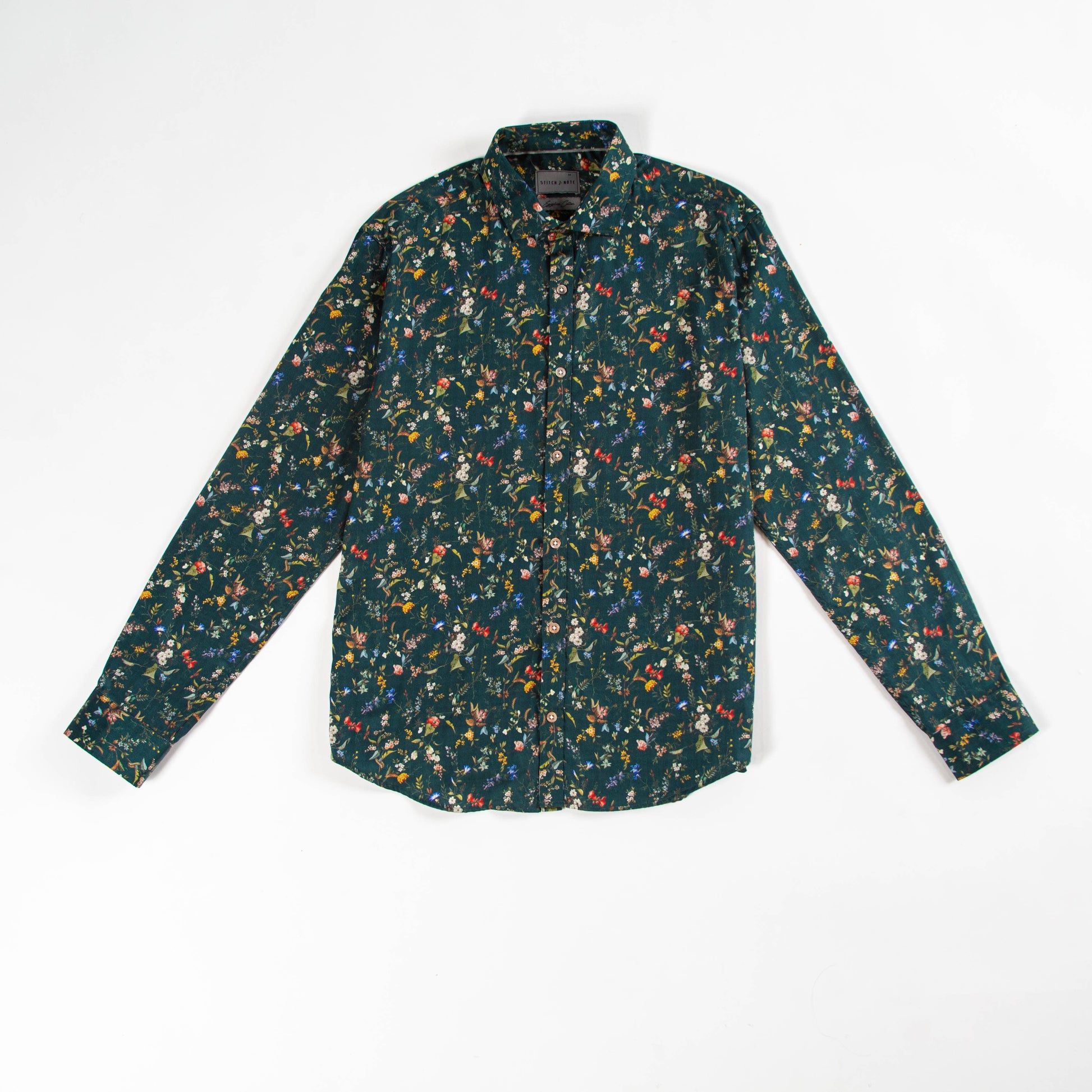 Spread collar long sleeve with multi color flowers, leaves, and stems allover print.
