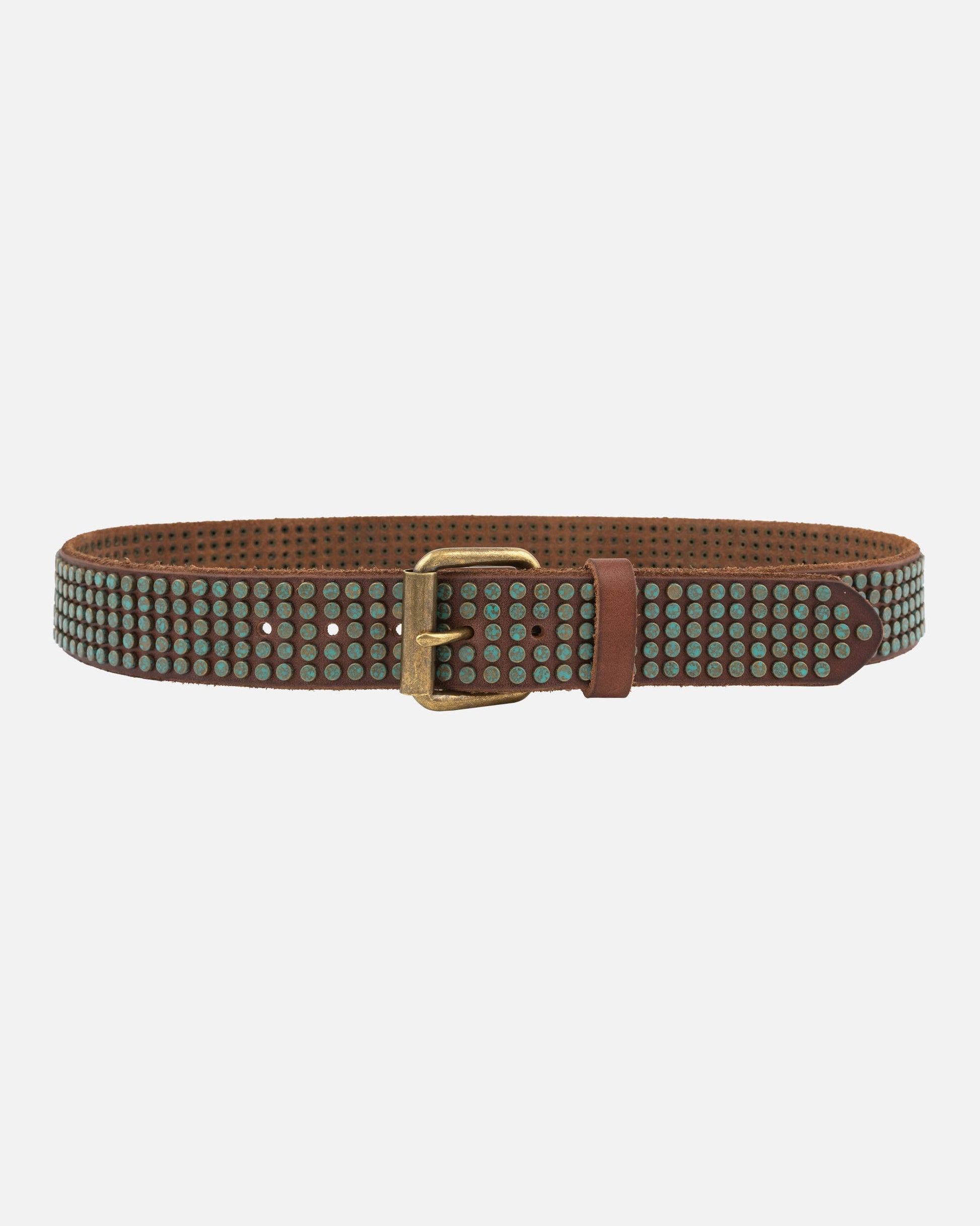 Bold and full of personality, the Eden Leather Belt features vibrant turquoise studs that create a stunning contrast. Finished with a classic antique brass buckle, this handcrafted belt makes a striking statement while maintaining the high-quality craftsmanship.
