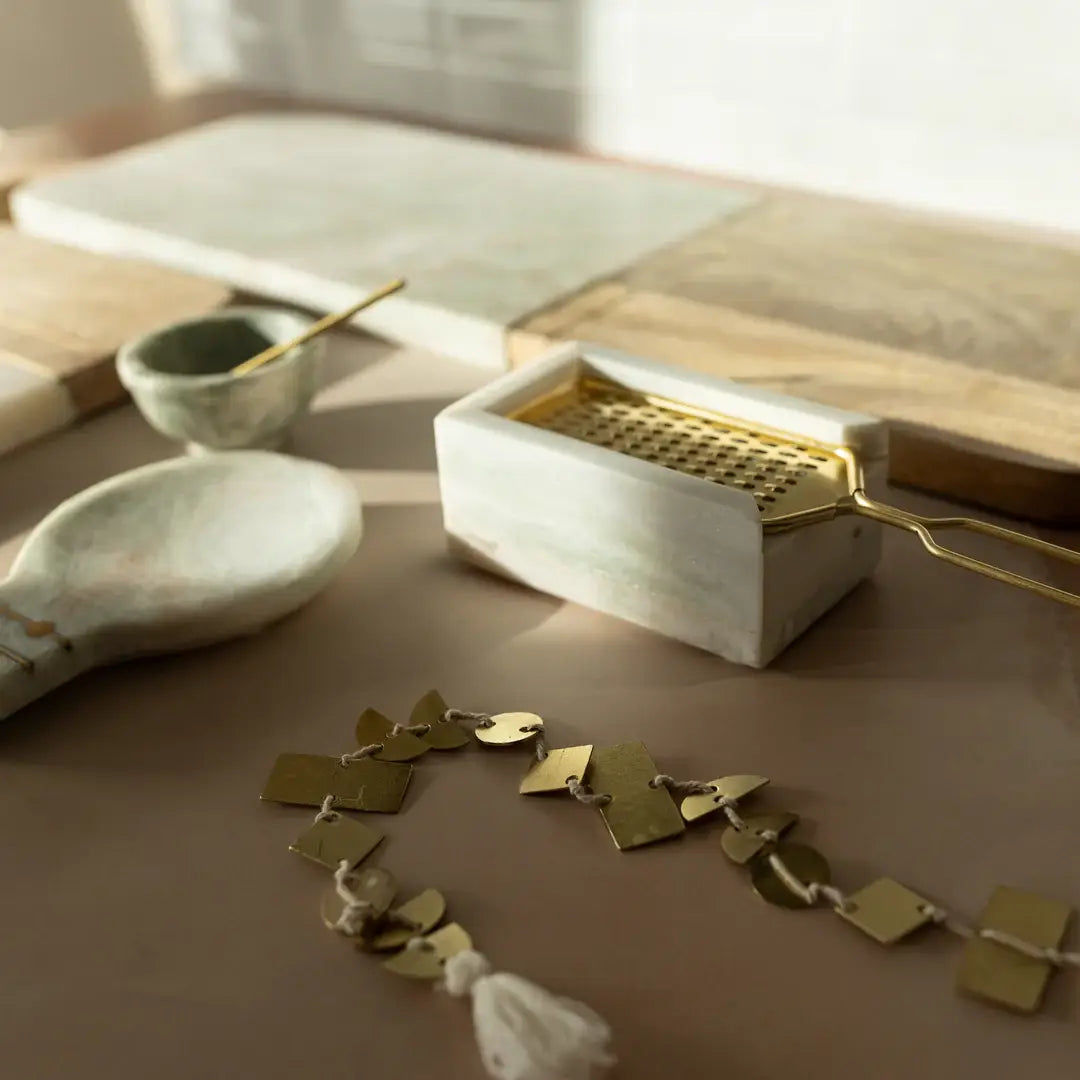 Grate with elegance using the Elise Cheese Grater, a stunning blend of function and form. Featuring a polished brass grater set into a solid base of light green onyx marble, this piece turns a kitchen essential into a statement. Whether used tableside or in the kitchen, it adds a refined touch to any culinary routine.