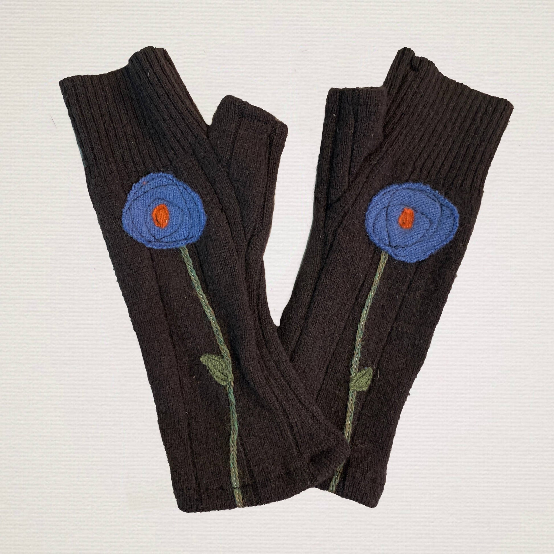 These are beautifully warm cashmere fingerless gloves. All gloves are individually made from super soft, lightly felted recycled cashmere and freestyle appliquéd so each pair is one of a kind.