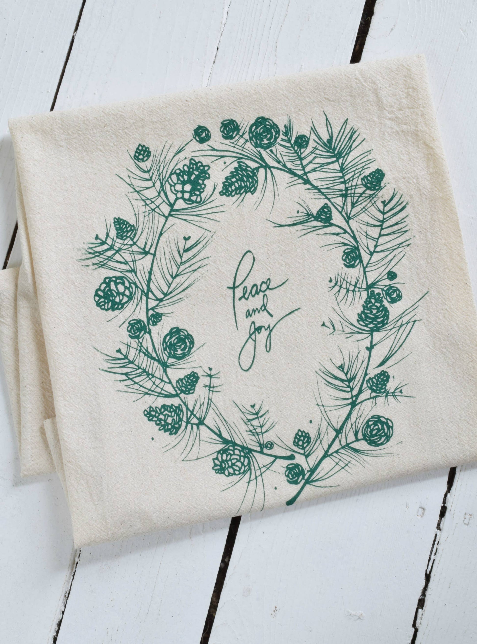 One large organic cotton tea towel (17" x 38") screen printed with my original Peace and Joy wreath design in green. These are designed and hand printed by me using eco friendly ink. Each towel has an organic tag and twill hanging loop.