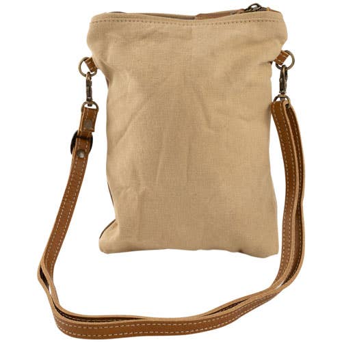 THE INSIDE OF BAG HAS BLUE STRIP TICKING FABRIC AND A ZIPPER POCKET 8"x10"
