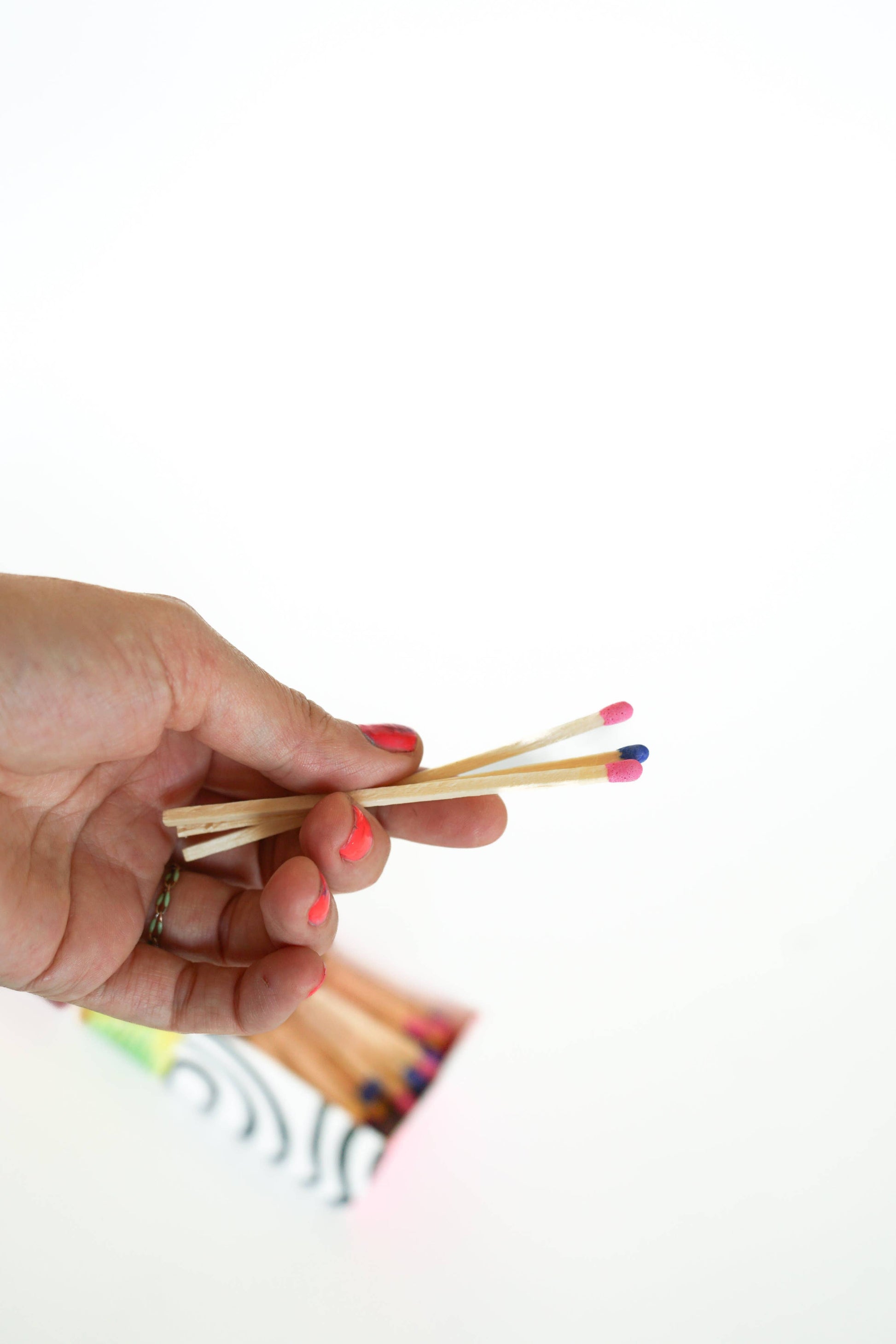 The original house matches started as a 3D model made from a cut up cereal box, and each side was hand painted at Adrienne's kitchen table. The sliding drawer holds 100 4" matches (with colorful match heads, of course!), and a large striker on the bottom gives you ample firing power. Pro tip: when the matches run out, just replace them with other 4" matches!