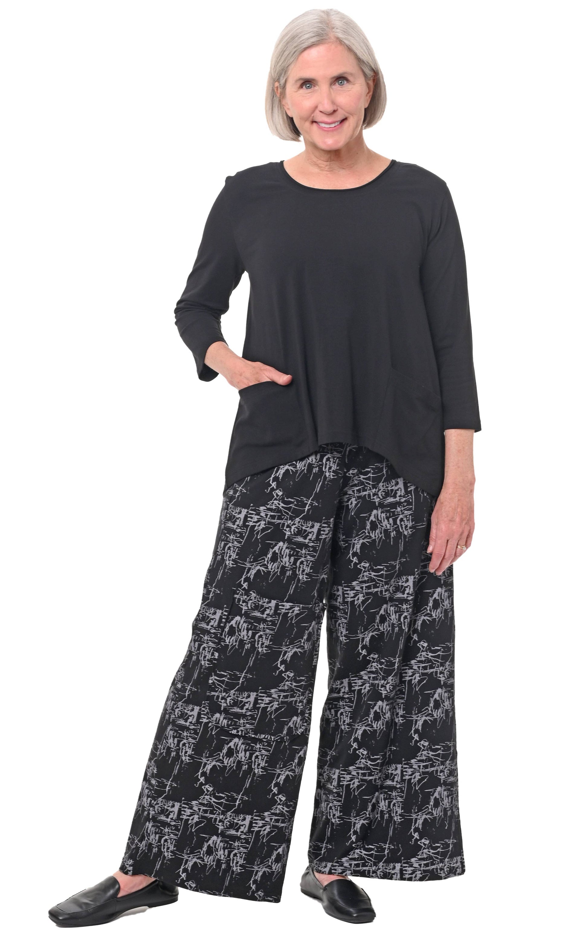 3/4 sleeved top with roll neckline, front patch pockets, and back slit. Back is 5" longer.
