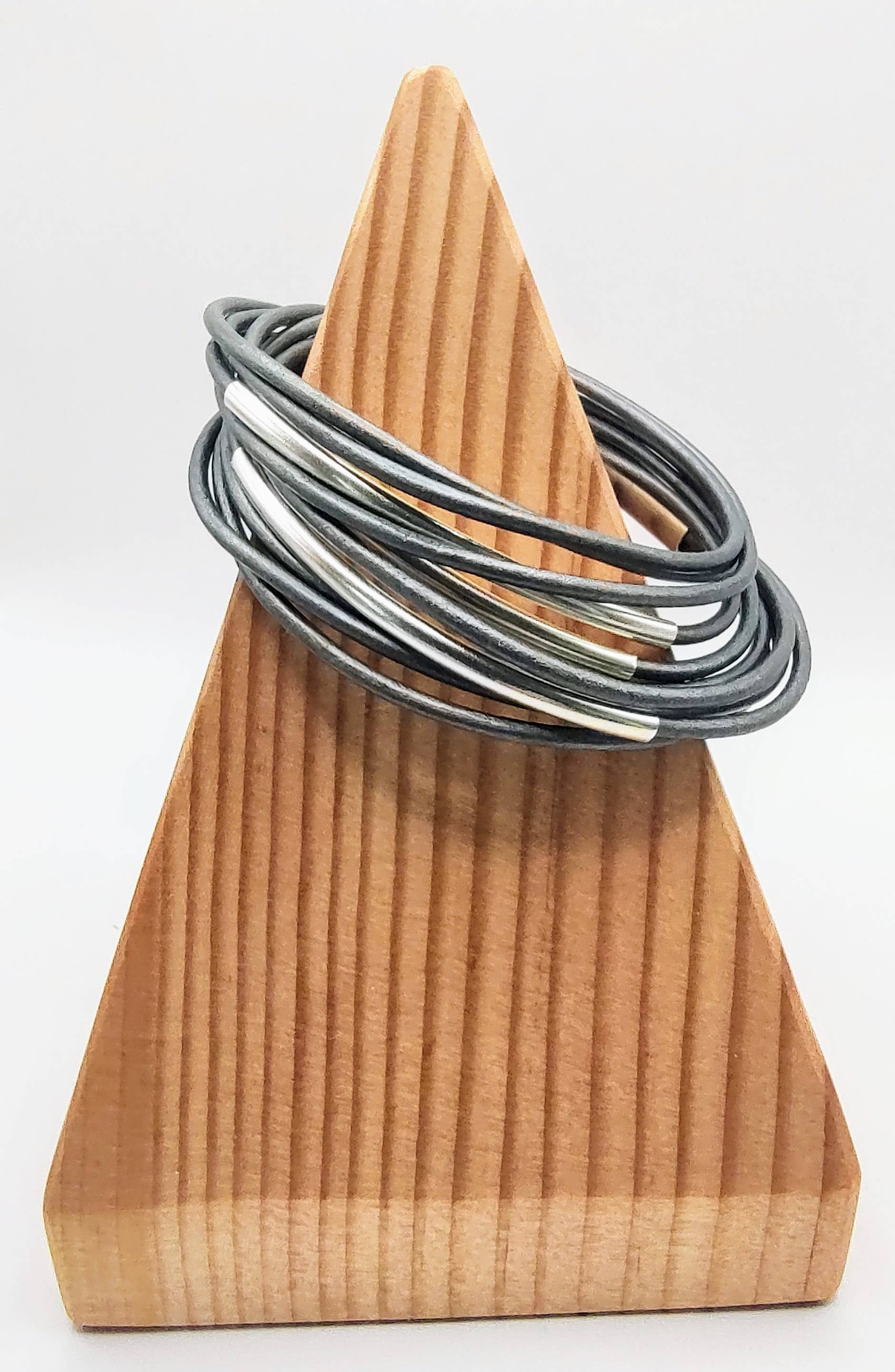 A double wrap bracelet and can be used as a single necklace. It is a 100% real leather bracelet made with 2 mm cord and silver plated tubes. It has a total of five leather cords that are wrapped around the wrist twice, allowing for a ten cord multilayered effect. It is made to fit the average wrist size of approximately 6 1/2 to 7 inches.
