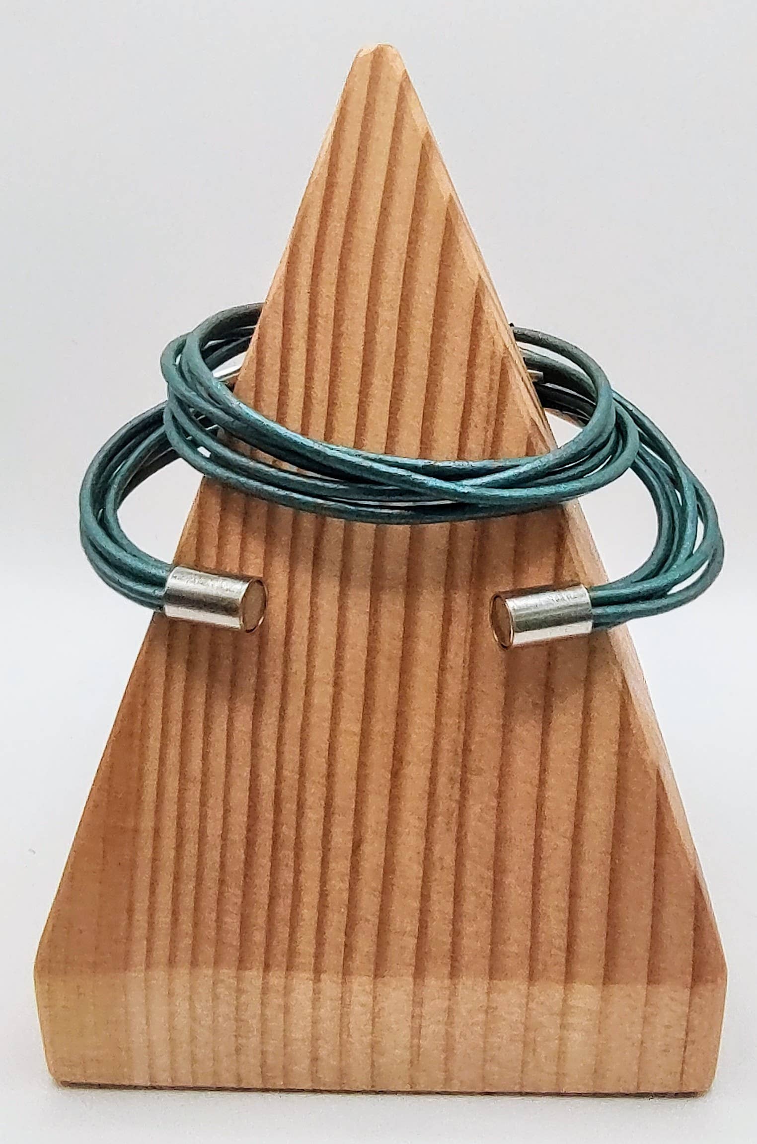 This is a double wrap bracelet and can also be used as a single necklace. It is a 100% real leather bracelet made with 2 mm cord and silver plated tubes. It has a total of five leather cords that are wrapped around the wrist twice, allowing for a ten cord multilayered effect. It is made to fit the average wrist size of approximately 6 1/2 to 7 inches.