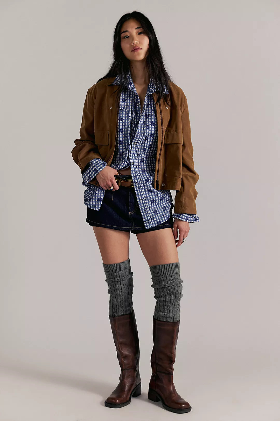 Features: Cotton fabrication with camo-inspired print and floral detailing, collared-neckline, button-front closures, drop-shoulder sleeves with cuffs, oversized chest-pocket detailing, shirttail hem, pleating at back with added dimension