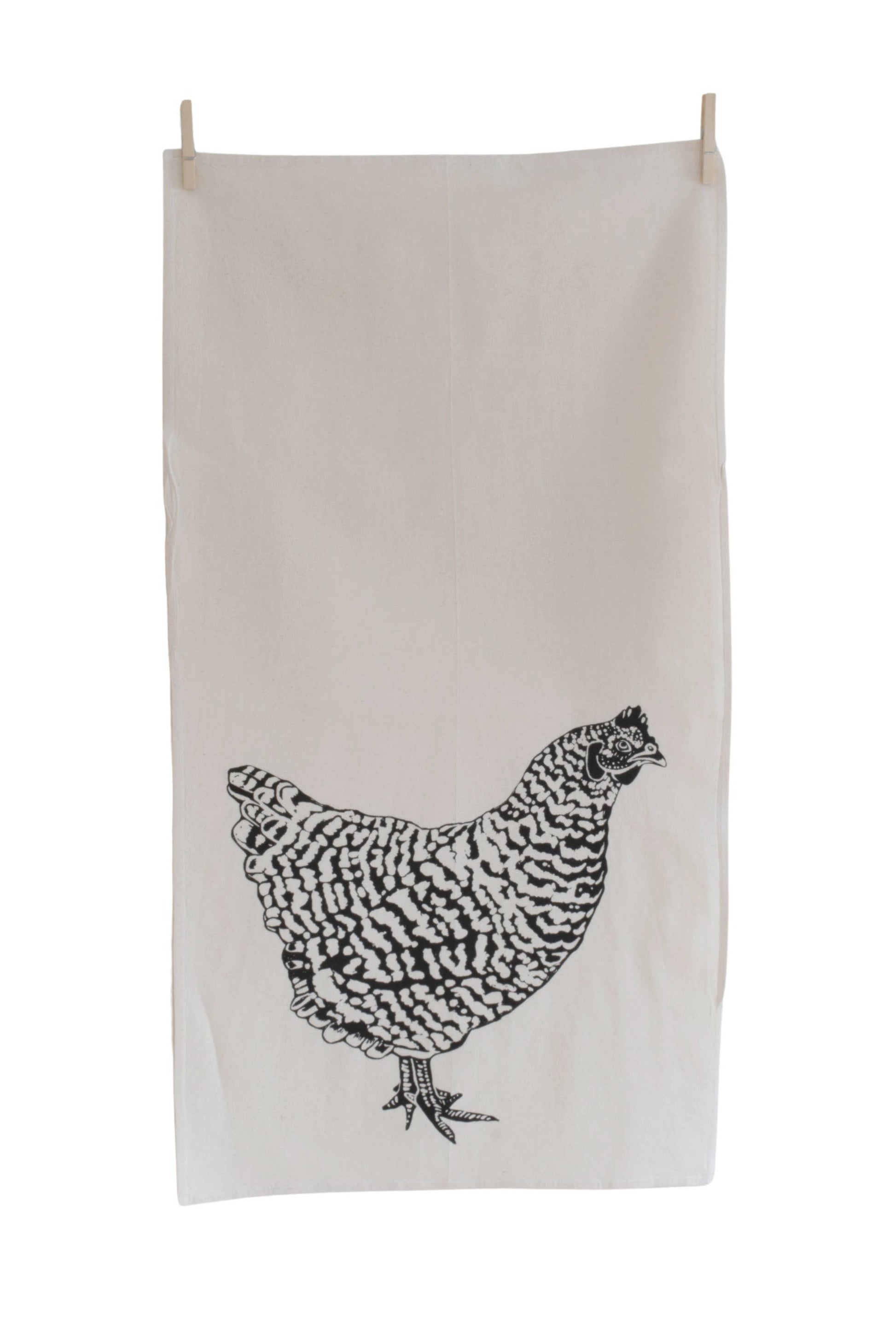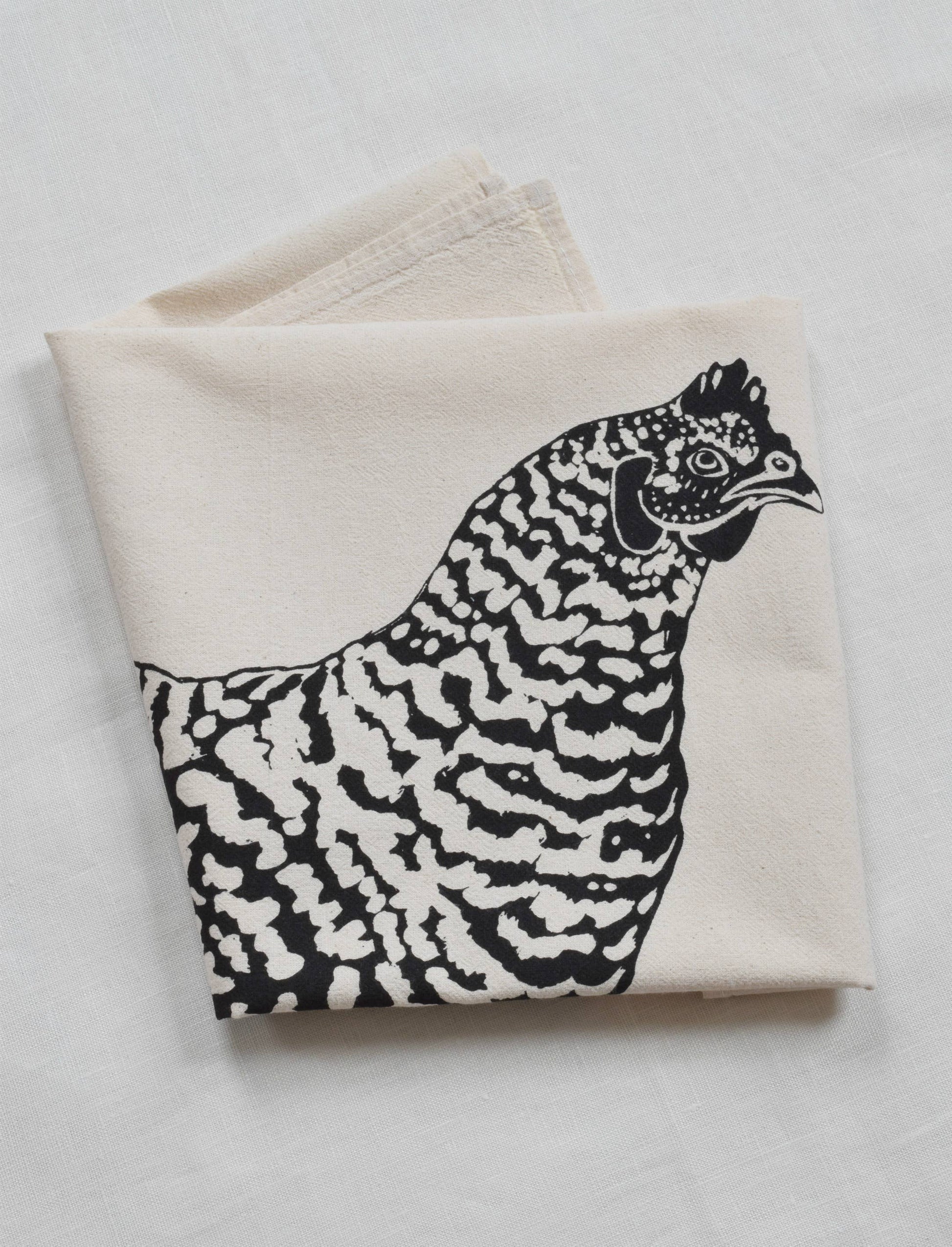 One large organic cotton tea towel (17" x 38") screen printed with my original Chicken design in black. These are designed and hand printed by me using eco friendly ink. Each towel has an organic tag and twill hanging loop.