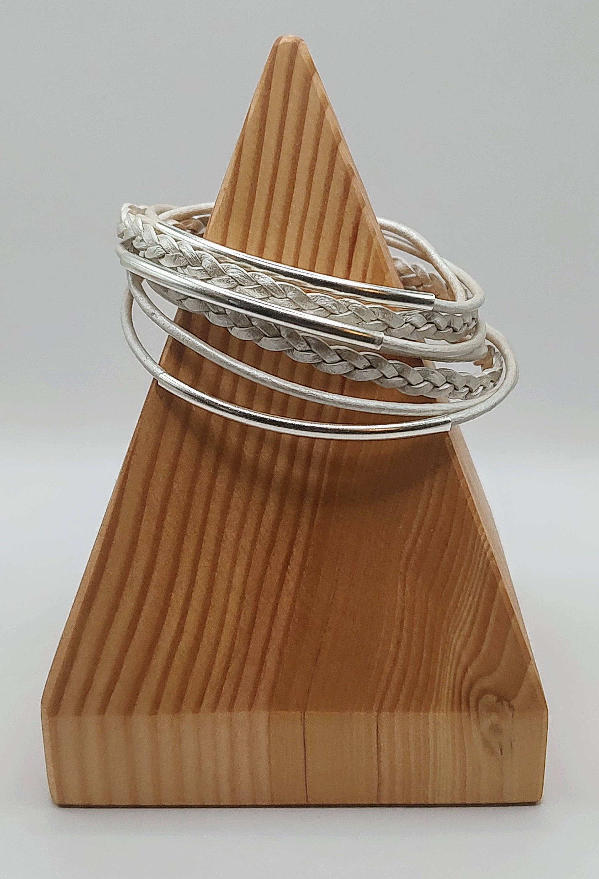 Beautiful pearl colored braided bracelet that wraps around the wrist twice creating a multilayered effect. Comes with silver plated tubes .
