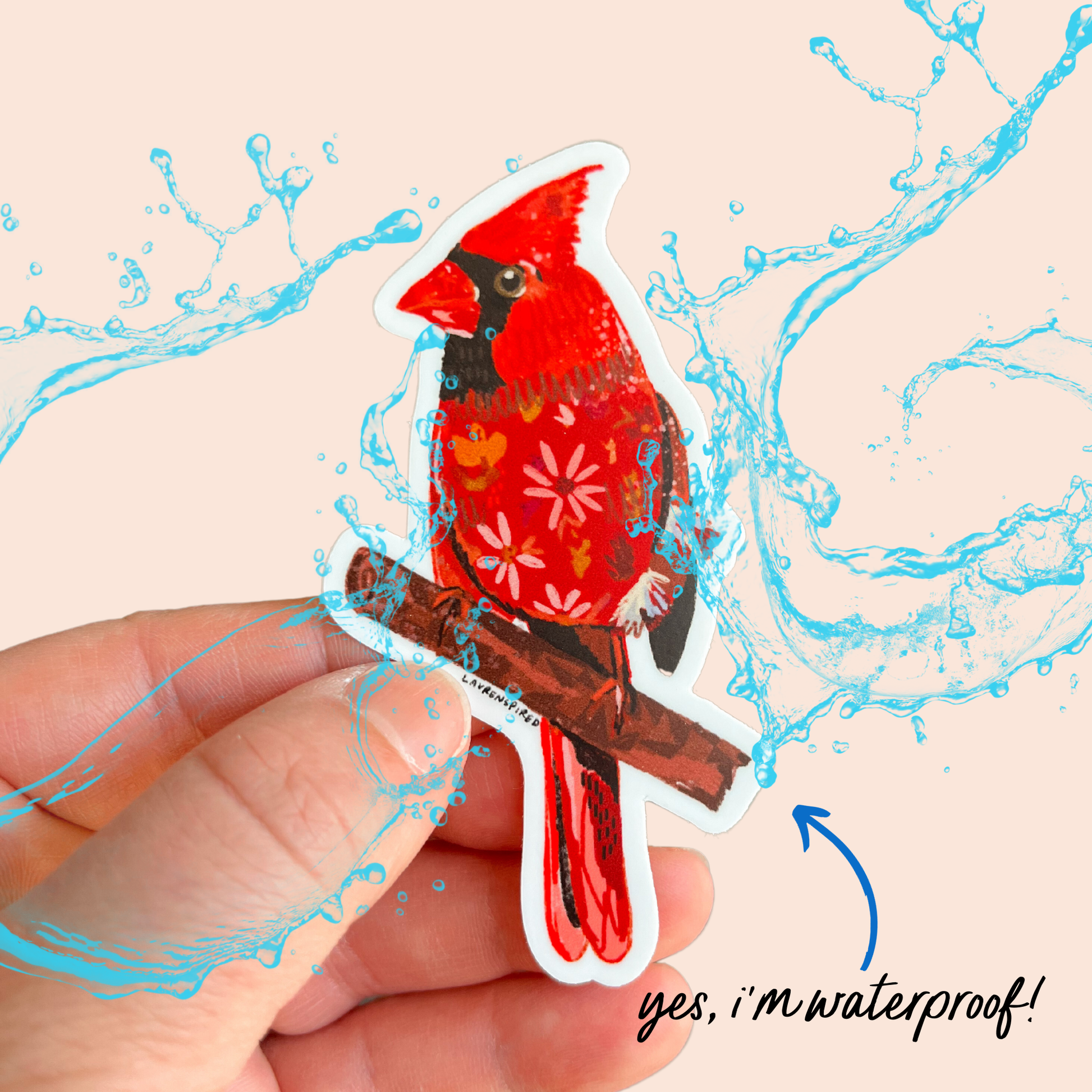 Sweet Red Cardinal Sticker for water bottle, laptop, kindle, garden journal, window, or other smooth surfaces.