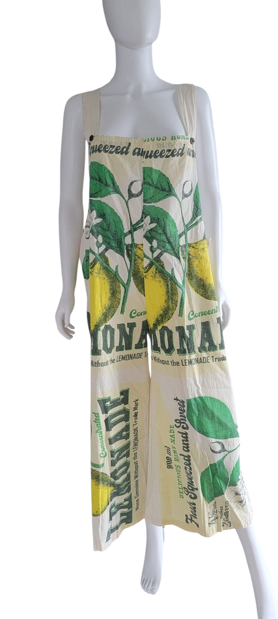 T2429 Reproduction of Flour Sack Cotton Jumpsuit with Straps- Lemonade A striking garment reimagined as fashion wear that transforms humble origins into a statement fashion and understated elegance 2 Large functional patch pockets on the back