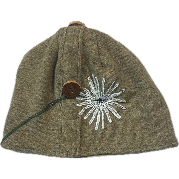 Our warm and cozy wool hats are individually made from recycled felted, wool sweaters. Each hat brim is lined with coordinating jersey knit for comfort. Playful free style sewn images make each hat one of a kind!